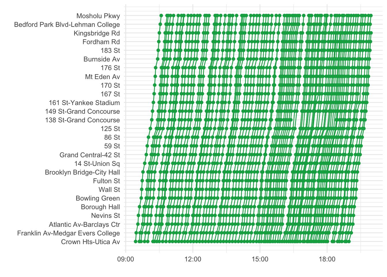 The horizontal distances between adjacent threads at each of the stops listed are equivalent to the wait times between trains. Thankfully they look pretty consistent, besides for a period starting in the late afternoon at 138th Street where it looks like service was suspended for a few hours.