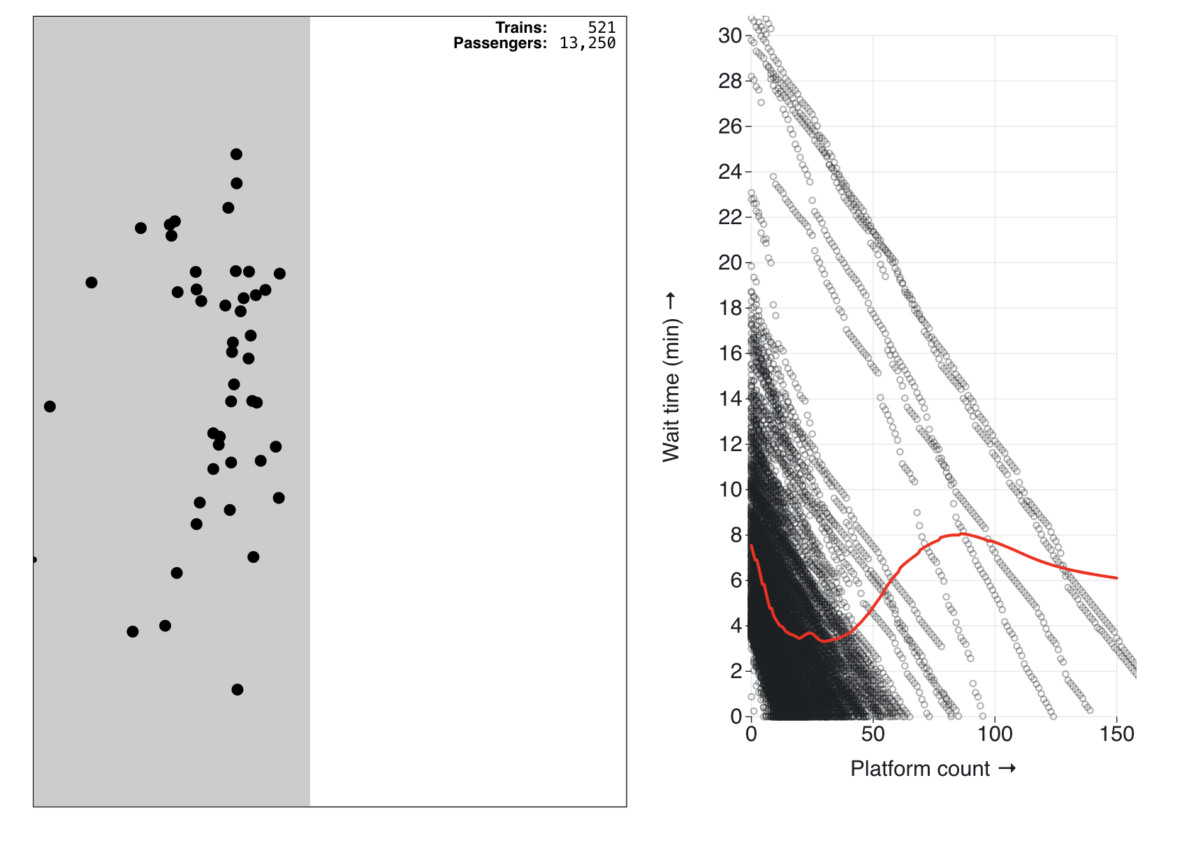 On the left, you’ll see passengers filter in continuously and spread out until a train appears from the top of the frame and whisks them away. Once the train has left, each passenger’s observed platform count and subsequent wait time is plotted on the graph to the right with an updating smoothed red trendline:
